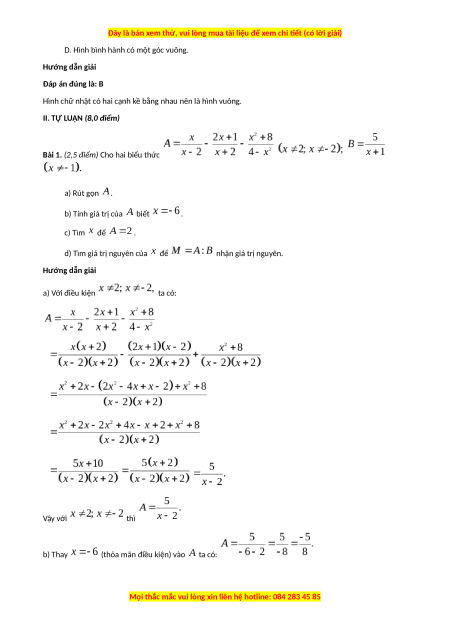 Câu 1. Điều kiện để giá trị phân thức xác định là: A. . B. . C. . D. . Hướng dẫn giải Đáp án đúng là: C