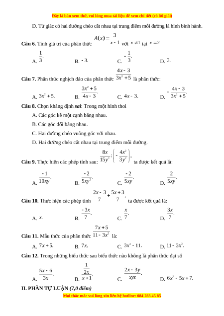 Câu 12. Trong những biểu thức sau biểu thức nào không là phân thức đại số A. B. C. D.