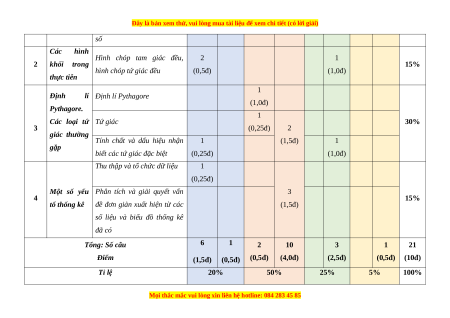 Tổng: Số câu 6 1 2 10 3 1 21 Điểm (1,5đ) (0,5đ) (0,5đ) (4,0đ) (2,5đ) (0,5đ) (10đ) Tỉ lệ 20% 50% 25% 5% 100%