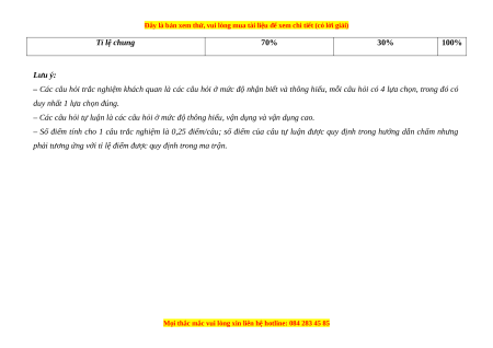 – Số điểm tính cho 1 câu trắc nghiệm là 0,25 điểm/câu; số điểm của câu tự luận được quy định trong hướng dẫn chấm nhưng