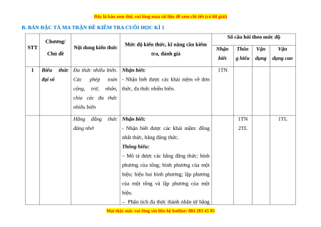 B. BẢN ĐẶC TẢ MA TRẬN ĐỀ KIỂM TRA CUỐI HỌC KÌ 1