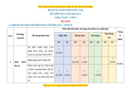 ĐỀ KIỂM TRA CUỐI HỌC KÌ 1 MÔN: TOÁN – LỚP 8 ĐỀ SỐ 06