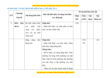 B. BẢN ĐẶC TẢ MA TRẬN ĐỀ KIỂM TRA CUỐI HỌC KÌ 1