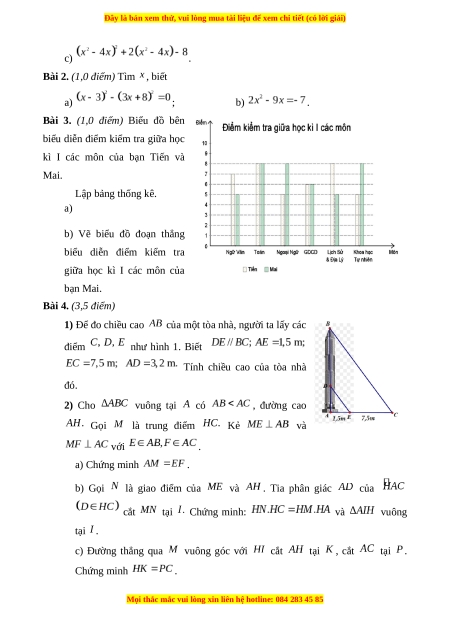 Tính chiều cao của tòa nhà đó. 2) Cho vuông tại có , đường cao Gọi là trung điểm Kẻ và với . a) Chứng minh . b) Gọi là giao điểm của và . Tia phân giác của cắt tại Chứng minh: và vuông tại . c) Đường thẳng qua vuông góc với cắt tại , cắt tại . Chứng minh .