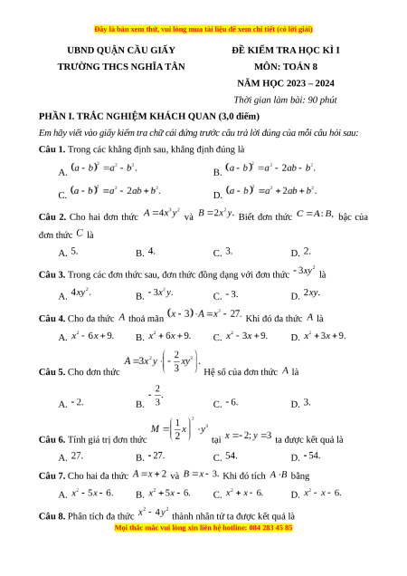 Đề thi cuối kì 1 Toán 8 Hà Nội trường THCS Nghĩa Tân