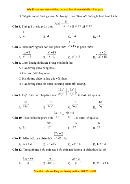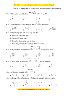 Câu 12. Trong những biểu thức sau biểu thức nào không là phân thức đại số A. B. C. D.