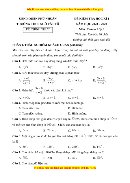 NĂM HỌC 2023 – 2024 ĐỀ CHÍNH THỨC Môn: Toán – Lớp 8