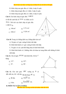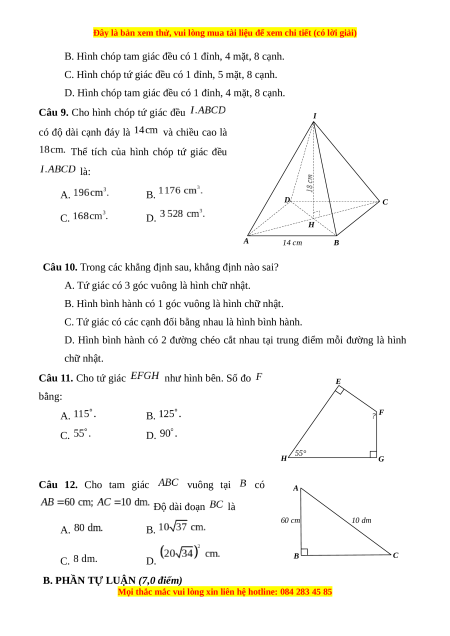 Câu 11. Cho tứ giác như hình bên. Số đo E bằng: A. B. F ? C. D. 55° H G Câu 12. Cho tam giác vuông tại có A Độ dài đoạn là 60 cm 10 dm A. B. C. D. B C