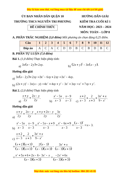 Đề thi cuối kì 1 Toán 8 Hồ Chí Minh trường THCS Nguyễn Tri Phương