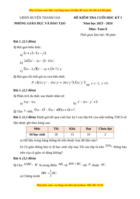 Đề thi cuối kì 1 Toán 8 huyện Thanh Oai TP Hà Nội
