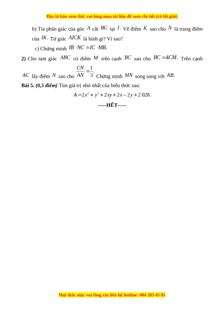 Bài 5. (0,5 điểm) Tìm giá trị nhỏ nhất của biểu thức sau: -----HẾT-----
