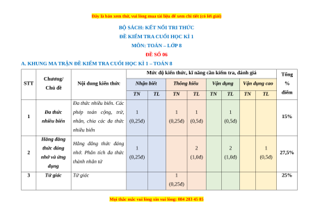 ĐỀ KIỂM TRA CUỐI HỌC KÌ 1 MÔN: TOÁN – LỚP 8 ĐỀ SỐ 06