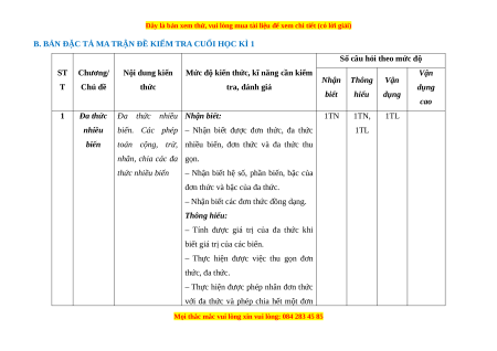 B. BẢN ĐẶC TẢ MA TRẬN ĐỀ KIỂM TRA CUỐI HỌC KÌ 1