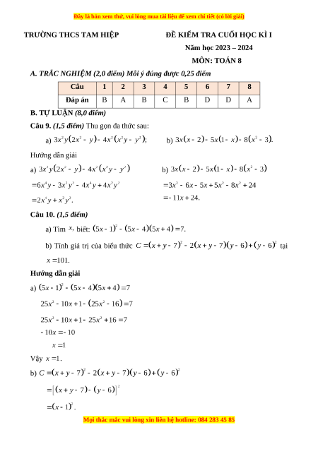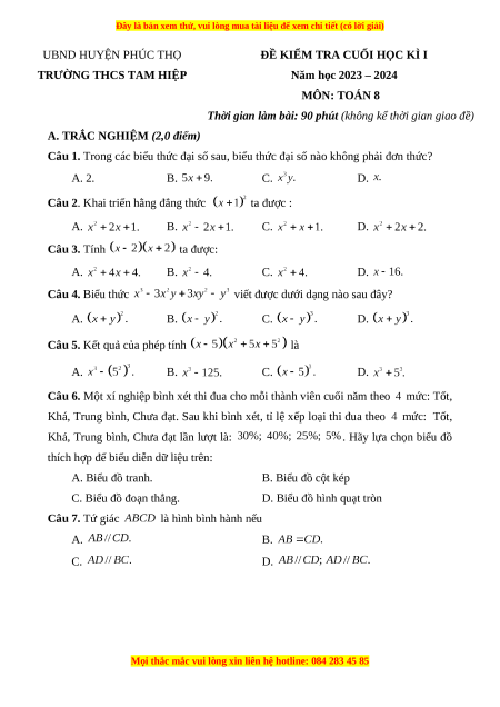Đề thi cuối kì 1 Toán 8 Kết nối tri thức Trường THCS Tam Hiệp-Hà Nội