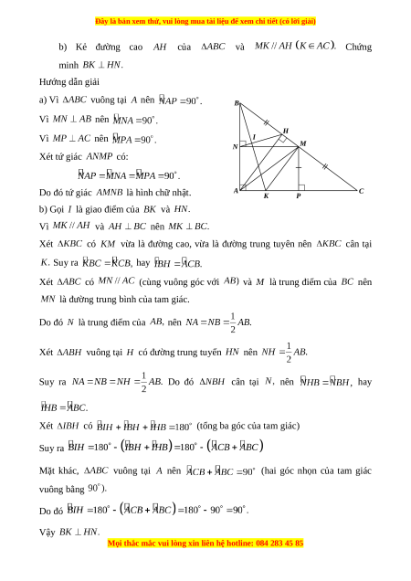 Câu 13. (1,5 điểm) Cho vuông tại có trung tuyến Kẻ và a) Tứ giác là hình gì? Vì sao? b) Kẻ đường cao của và Chứng minh