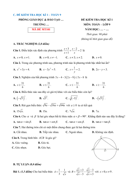 ĐỀ KIỂM TRA HỌC KÌ 1 TRƯỜNG … MÔN: TOÁN – LỚP 9 MÃ ĐỀ MT101 NĂM HỌC: … – … Thời gian: 90 phút