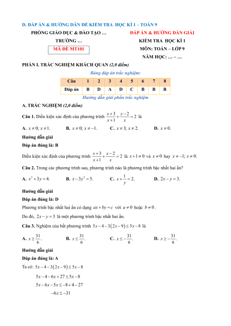ĐÁP ÁN & HƯỚNG DẪN GIẢI TRƯỜNG … KIỂM TRA HỌC KÌ 1 MÃ ĐỀ MT101 MÔN: TOÁN – LỚP 9 NĂM HỌC: … – …