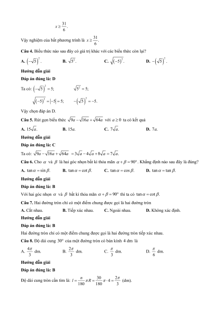 Câu 5. Rút gọn biểu thức 9a 16a 64a với a 0 ta có kết quả A. 15 a. B. 15 . a C. 7 a. D. 7 . a