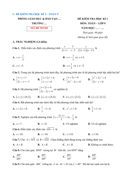 ĐỀ KIỂM TRA HỌC KÌ 1 TRƯỜNG … MÔN: TOÁN – LỚP 9 MÃ ĐỀ MT201 NĂM HỌC: … – … Thời gian: 90 phút