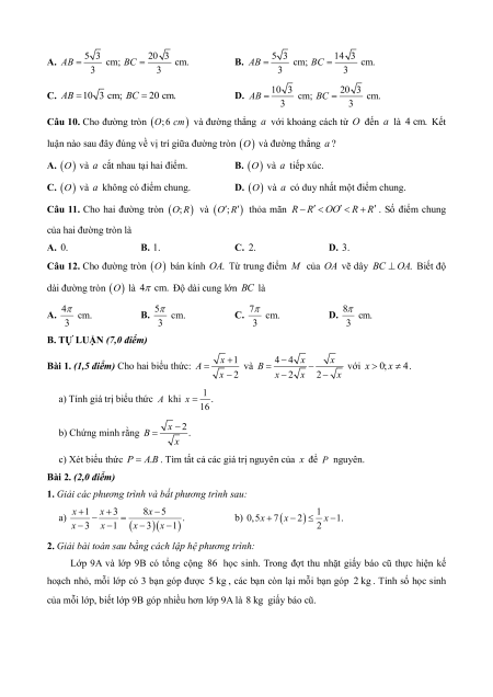 Câu 10. Cho đường tròn O;6 cm và đường thẳng a với khoảng cách từ O đến a là 4 cm. Kết