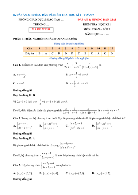 ĐÁP ÁN & HƯỚNG DẪN GIẢI TRƯỜNG … KIỂM TRA HỌC KÌ 1 MÃ ĐỀ MT201 MÔN: TOÁN – LỚP 9 NĂM HỌC: … – …