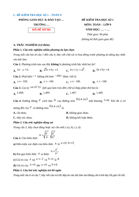 ĐỀ KIỂM TRA HỌC KÌ 1 TRƯỜNG … MÔN: TOÁN – LỚP 9 MÃ ĐỀ MT301 NĂM HỌC: … – … Thời gian: 90 phút