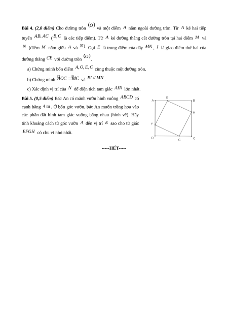 Bài 5. (0,5 điểm) Bác An có mảnh vườn hình vuông có cạnh bằng
