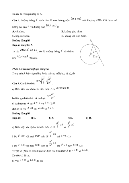 Câu 4. Đường thẳng cách tâm của đường tròn một khoảng Khi đó vị trí