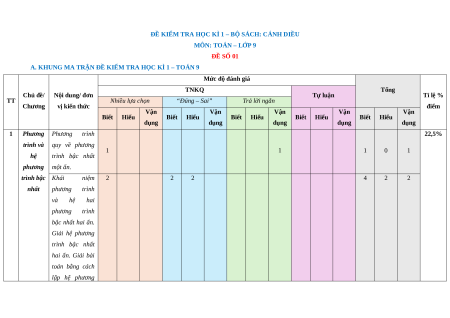 ĐỀ KIỂM TRA HỌC KÌ 1 – BỘ SÁCH: CÁNH DIỀU MÔN: TOÁN – LỚP 9 ĐỀ SỐ 01