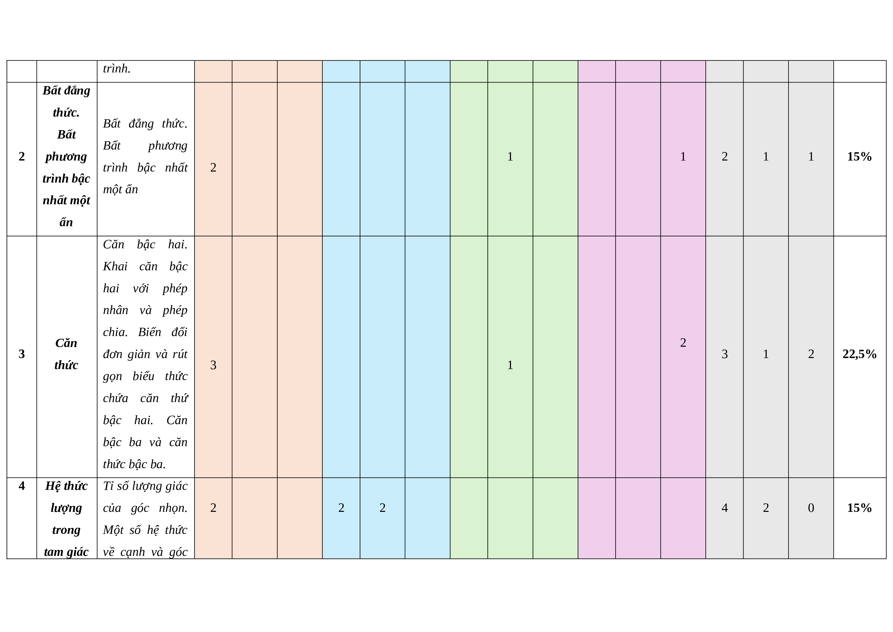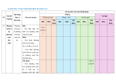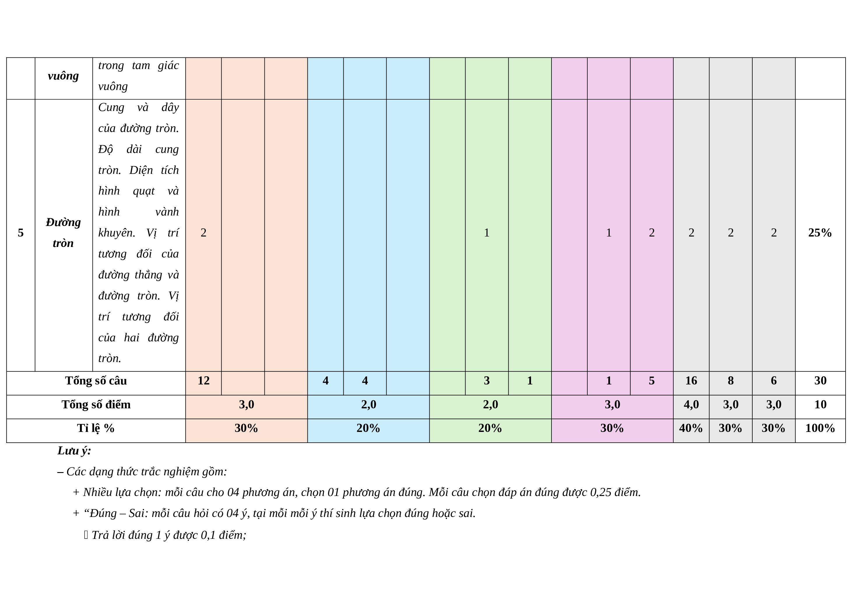 tam giác về cạnh và góc trong tam giác vuông vuông Cung và dây của đường tròn. Độ dài cung tròn. Diện tích hình quạt và hình vành Đường 5 khuyên. Vị trí 2 1 1 2 2 2 2 25% tròn tương đối của đường thẳng và đường tròn. Vị trí tương đối của hai đường tròn. Tổng số câu 12 4 4 3 1 1 5 16 8 6 30 Tổng số điểm 3,0 2,0 2,0 3,0 4,0 3,0 3,0 10 Tỉ lệ % 30% 20% 20% 30% 40% 30% 30% 100% Lưu ý: