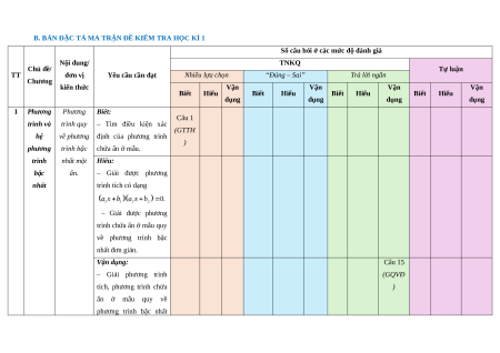A. KHUNG MA TRẬN ĐỀ KIỂM TRA HỌC KÌ 1 – TOÁN 9 Mức độ đánh giá TNKQ Tổng Chủ đề/ Nội dung/ đơn Tự luận Tỉ lệ % TT Nhiều lựa chọn “Đúng – Sai” Trả lời ngắn Chương vị kiến thức điểm Vận Vận Vận Vận Vận Biết Hiểu Biết Hiểu Biết Hiểu Biết Hiểu Biết Hiểu dụng dụng dụng dụng dụng 1