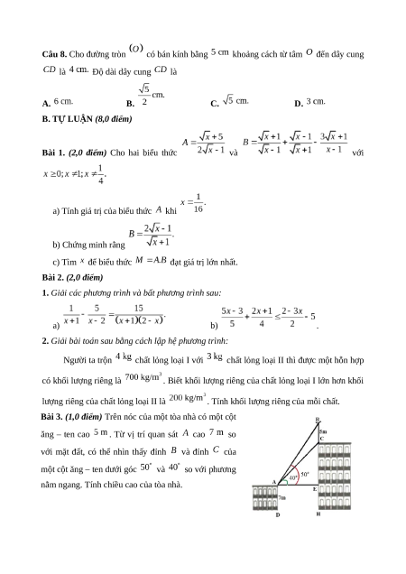 Bài 3. (1,0 điểm) Trên nóc của một tòa nhà có một cột ăng – ten cao