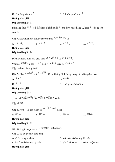 Câu 4. Điều kiện xác định của biểu thức là A. . B. . C. . D. . Câu 5. Cho và