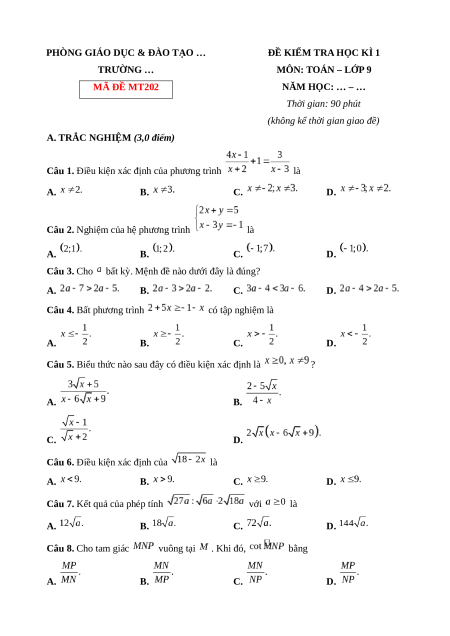 ĐỀ KIỂM TRA HỌC KÌ 1 TRƯỜNG … MÔN: TOÁN – LỚP 9 MÃ ĐỀ MT202 NĂM HỌC: … – … Thời gian: 90 phút