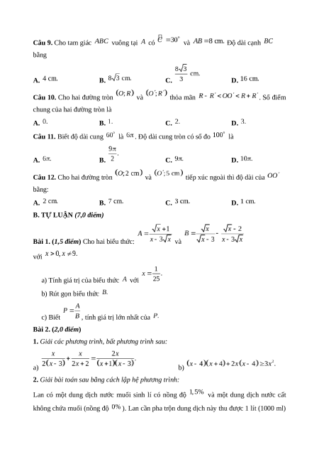 D. ĐÁP ÁN & HƯỚNG DẪN ĐỀ KIỂM TRA HỌC KÌ 1 – TOÁN 9