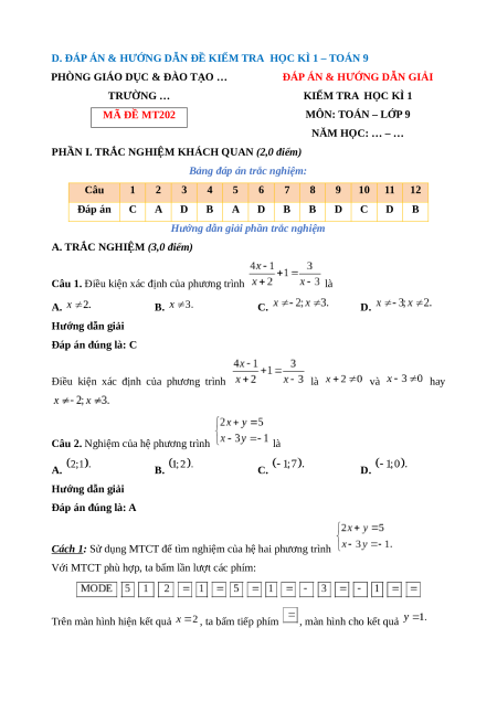 ĐÁP ÁN & HƯỚNG DẪN GIẢI TRƯỜNG … KIỂM TRA HỌC KÌ 1 MÃ ĐỀ MT202 MÔN: TOÁN – LỚP 9 NĂM HỌC: … – …