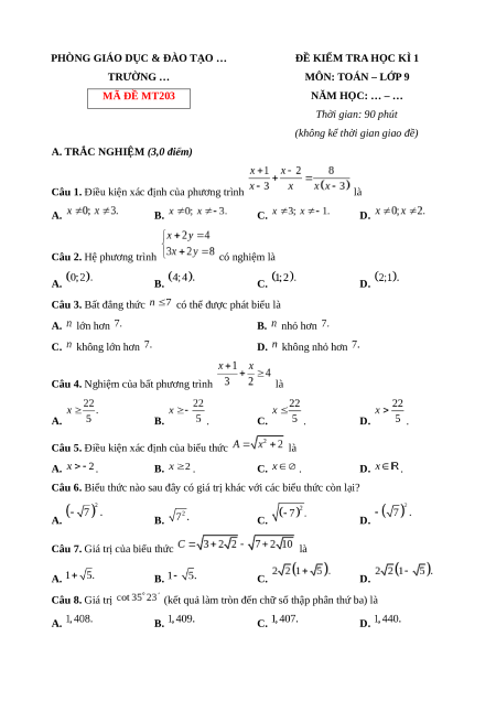 ĐỀ KIỂM TRA HỌC KÌ 1 TRƯỜNG … MÔN: TOÁN – LỚP 9 MÃ ĐỀ MT203 NĂM HỌC: … – … Thời gian: 90 phút