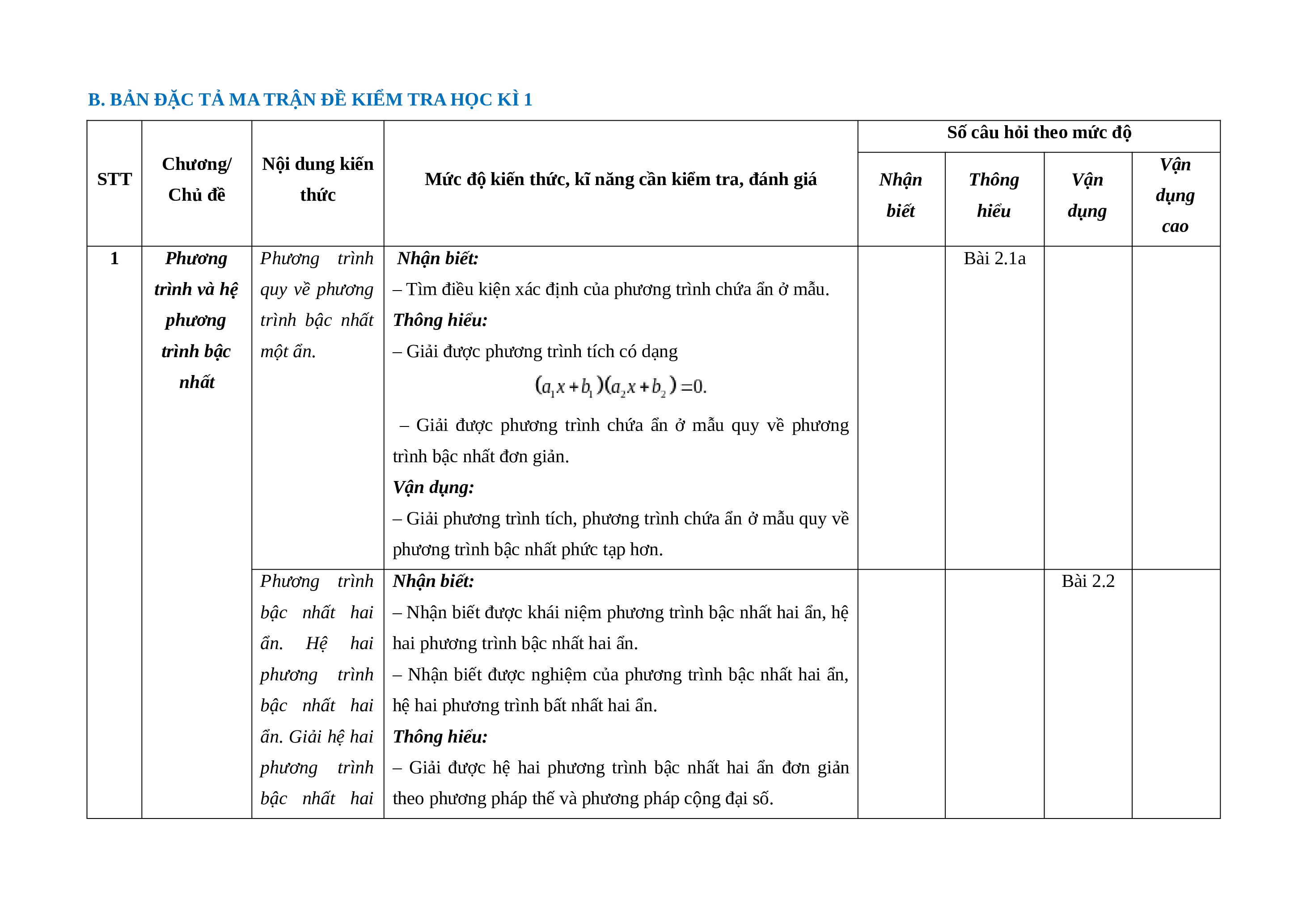 B. BẢN ĐẶC TẢ MA TRẬN ĐỀ KIỂM TRA HỌC KÌ 1