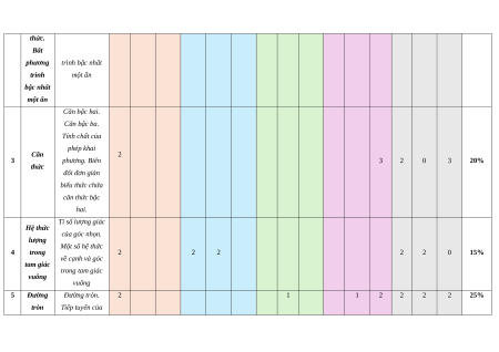 Một số hệ thức 4 trong 2 2 2 2 2 0 15% về cạnh và góc tam giác trong tam giác vuông vuông 5 Đường Đường tròn. 2 1 1 2 2 2 2 25% tròn Tiếp tuyến của đường tròn. Góc ở tâm, góc nội tiếp. Hình quạt tròn và hình vành khuyên. Tổng số câu 12 4 4 3 1 1 5 16 8 6 30 Tổng số điểm 3,0 2,0 2,0 3,0 4,0 3,0 3,0 10 Tỉ lệ % 30% 20% 20% 30% 40 30 30 100% Lưu ý: