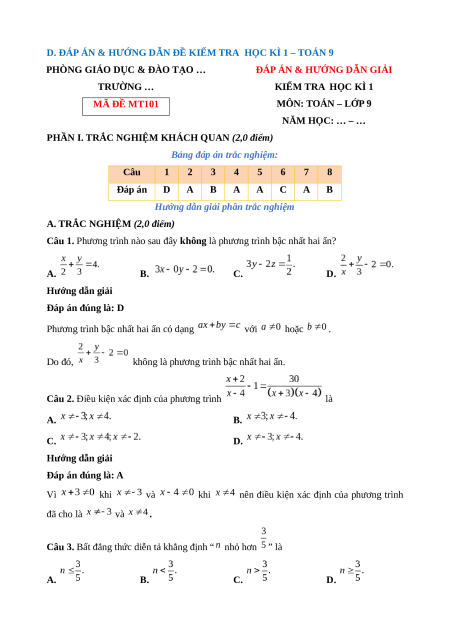 ĐÁP ÁN & HƯỚNG DẪN GIẢI TRƯỜNG … KIỂM TRA HỌC KÌ 1 MÃ ĐỀ MT101