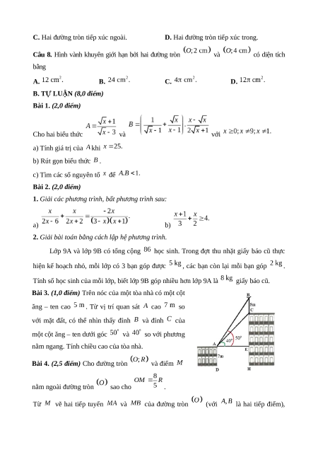 D. ĐÁP ÁN & HƯỚNG DẪN ĐỀ KIỂM TRA HỌC KÌ 1 – TOÁN 9