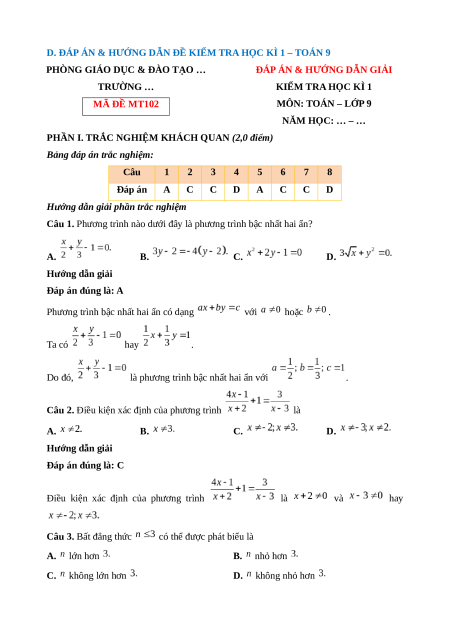ĐÁP ÁN & HƯỚNG DẪN GIẢI TRƯỜNG … KIỂM TRA HỌC KÌ 1 MÃ ĐỀ MT102