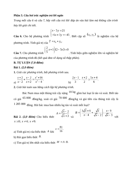 Câu 6. Cho hệ phương trình . Biết cặp số là nghiệm của hệ