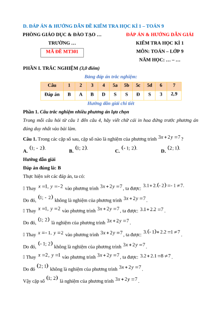 MÔN: TOÁN – LỚP 9 MÃ ĐỀ MT301 NĂM HỌC: … – …