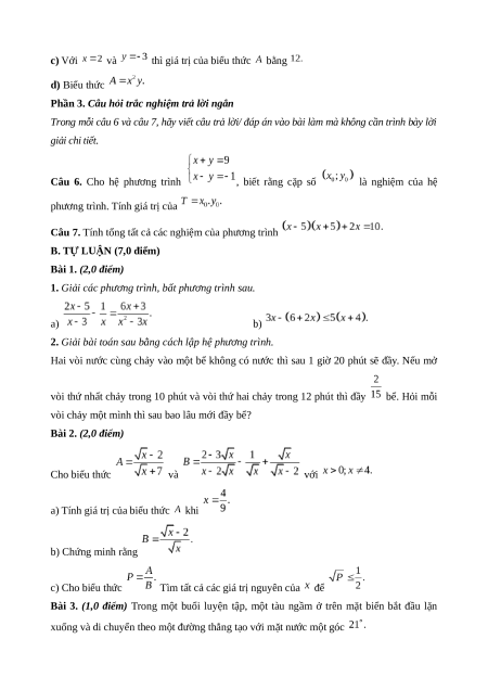 Câu 6. Cho hệ phương trình , biết rằng cặp số là nghiệm của hệ