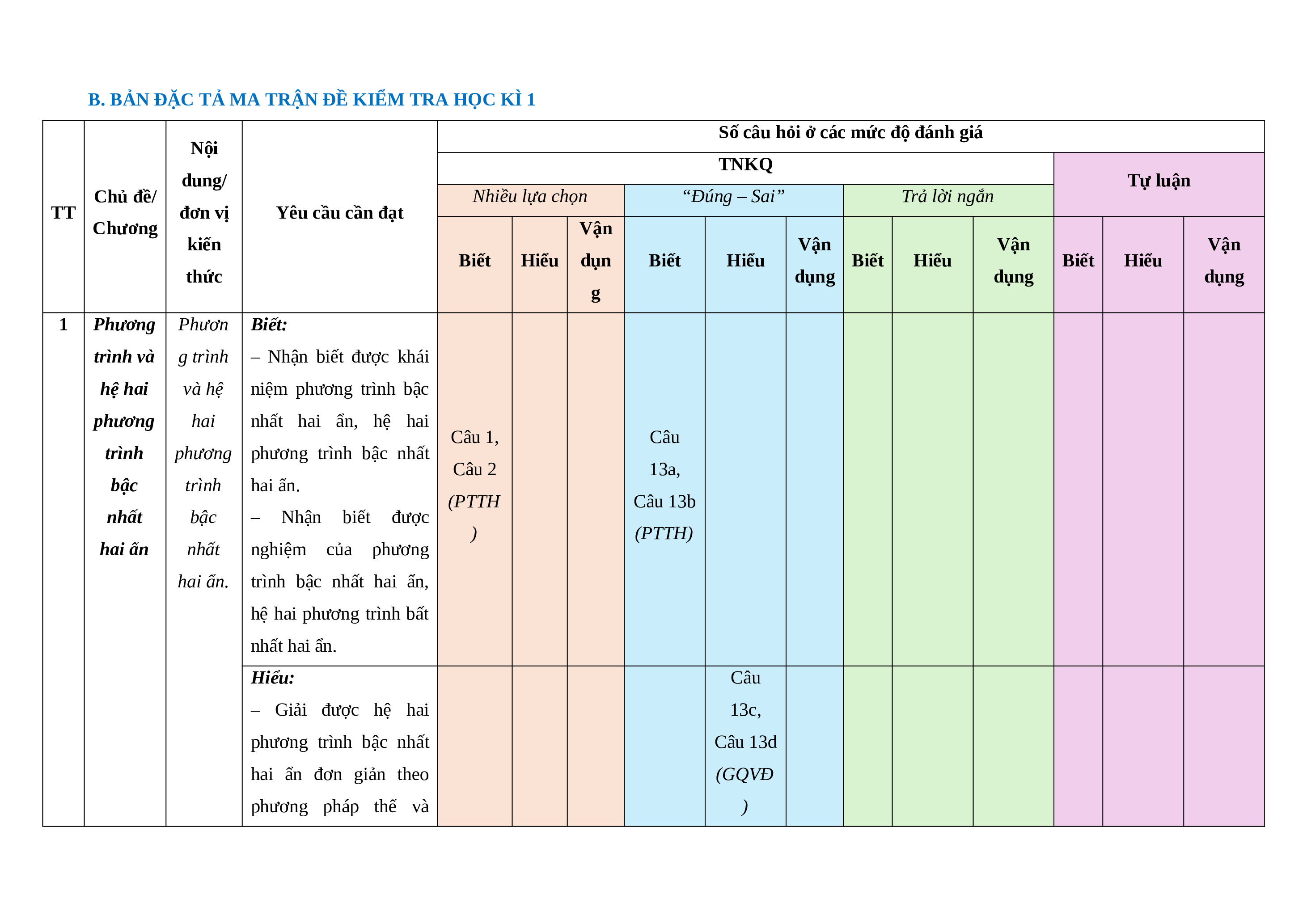 A. KHUNG MA TRẬN ĐỀ KIỂM TRA HỌC KÌ 1 – TOÁN 9 Mức độ đánh giá Nội dung/ TNKQ Tổng Chủ đề/ Tự luận Tỉ lệ % TT đơn vị kiến Nhiều lựa chọn “Đúng – Sai” Trả lời ngắn Chương điểm thức Vận Vận Vận Vận Vận Biết Hiểu Biết Hiểu Biết Hiểu Biết Hiểu Biết Hiểu dụng dụng dụng dụng dụng 1 Phương Khái niệm 2 2 2 4 2 0 15% trình và phương hệ hai trình và hệ phương hai phương trình trình bậc