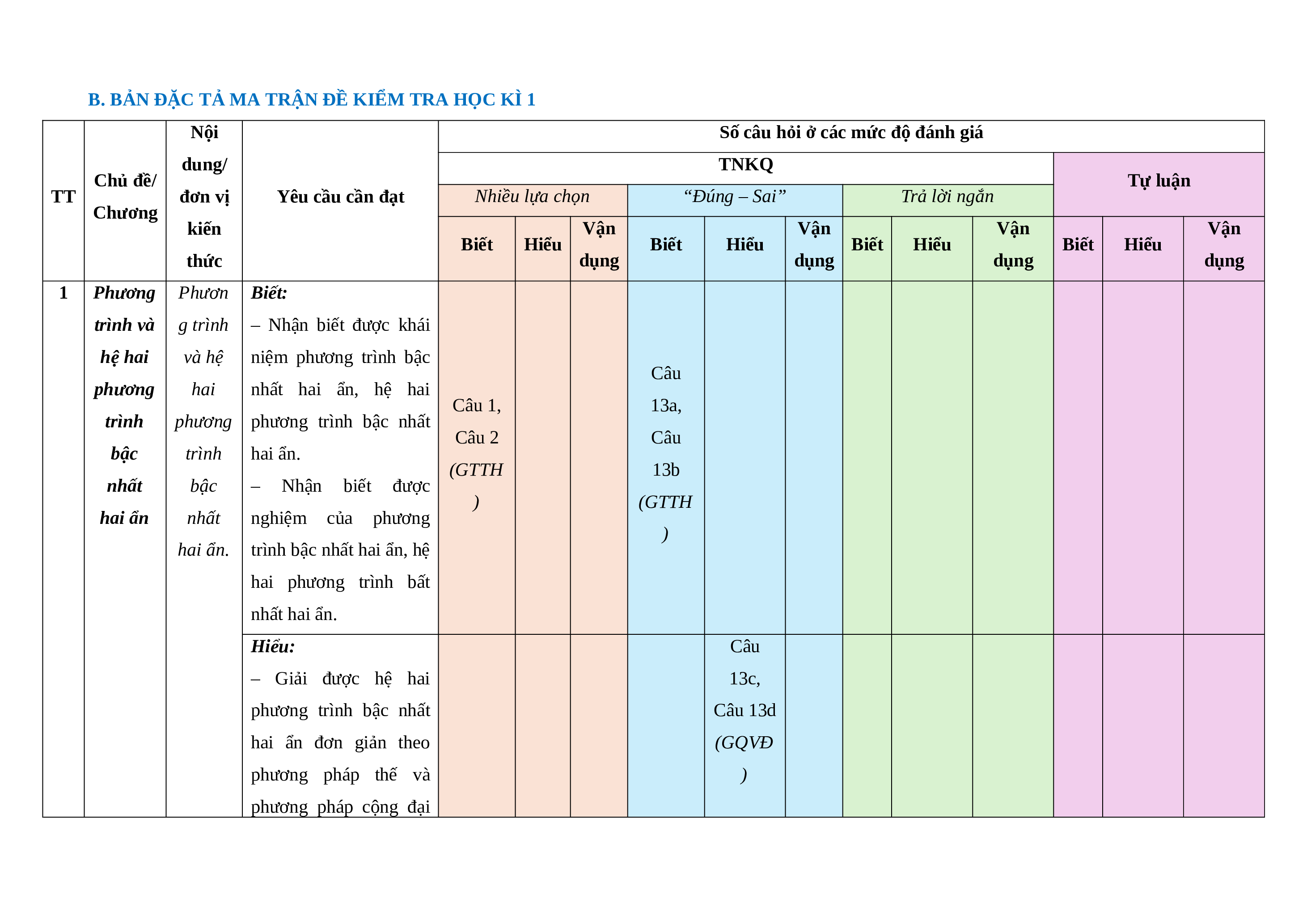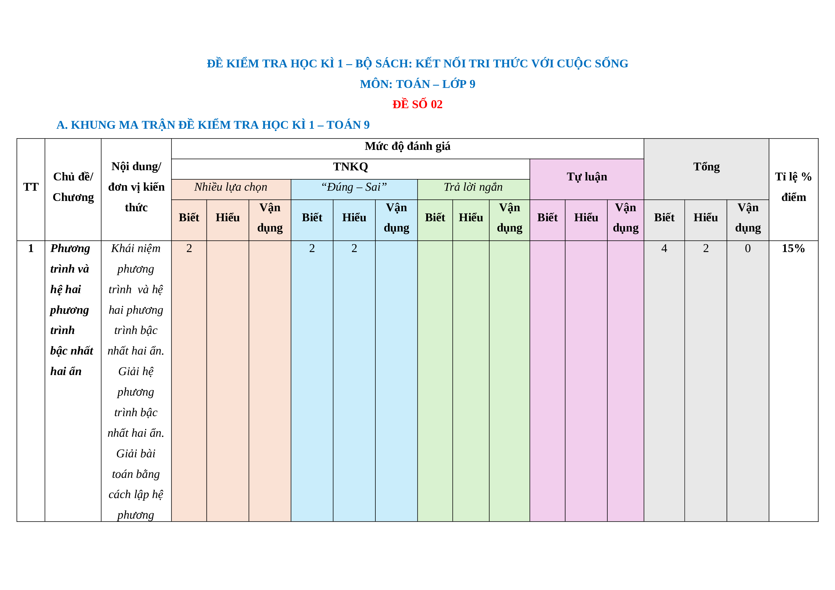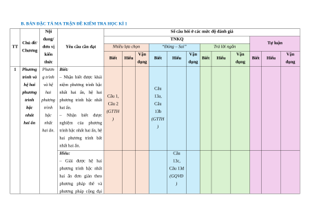 A. KHUNG MA TRẬN ĐỀ KIỂM TRA HỌC KÌ 1 – TOÁN 9 Mức độ đánh giá Nội dung/ TNKQ Tổng Chủ đề/ Tự luận Tỉ lệ % TT đơn vị kiến Nhiều lựa chọn “Đúng – Sai” Trả lời ngắn Chương điểm thức Vận Vận Vận Vận Vận Biết Hiểu Biết Hiểu Biết Hiểu Biết Hiểu Biết Hiểu dụng dụng dụng dụng dụng 1 Phương Khái niệm 2 2 2 4 2 0 15% trình và phương hệ hai trình và hệ phương hai phương trình trình bậc