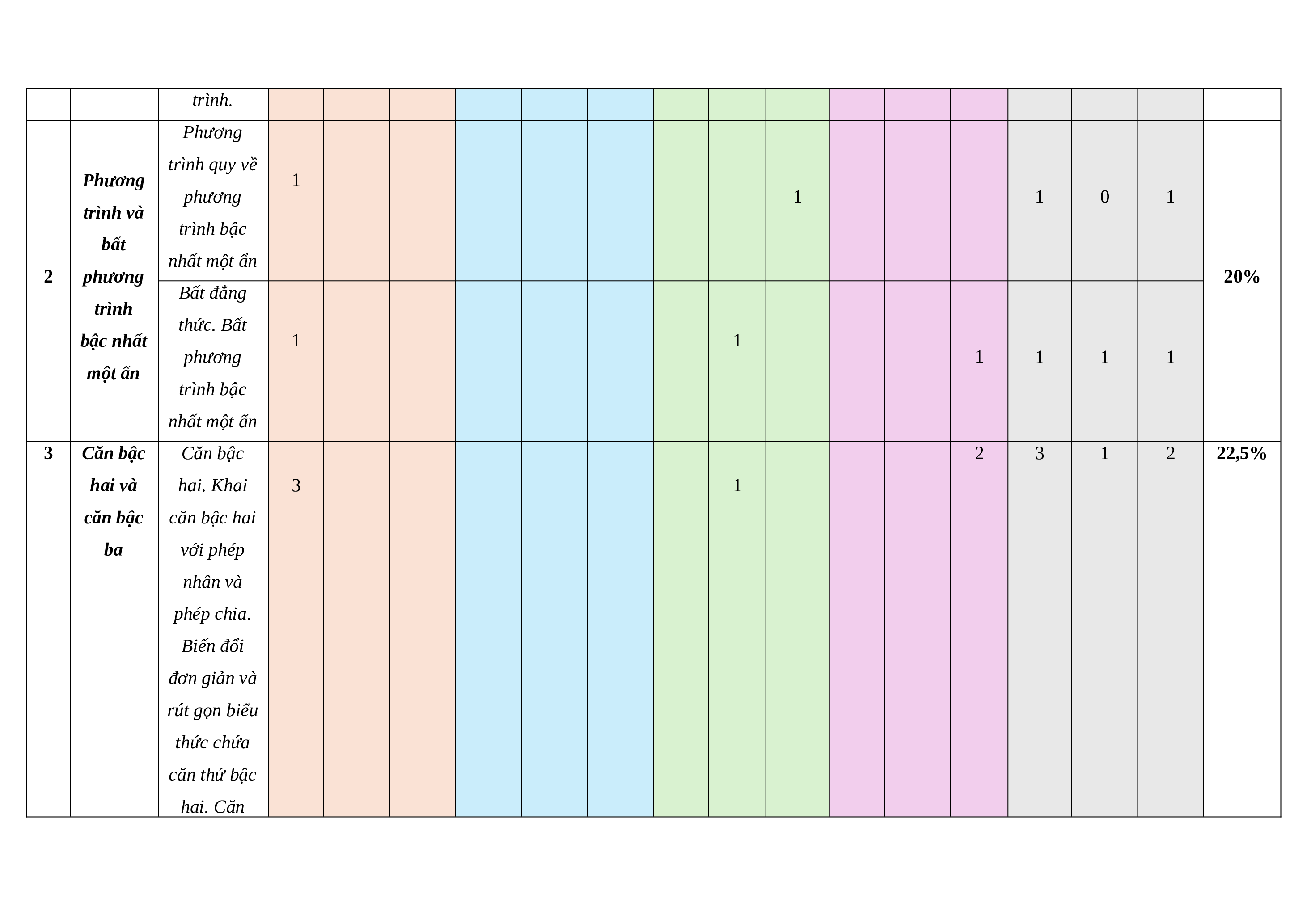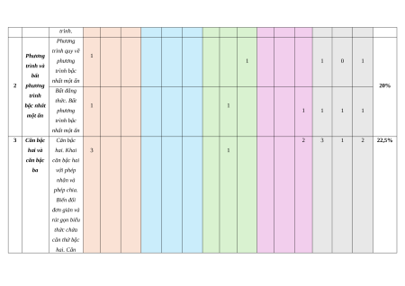 bậc nhất nhất hai ẩn. hai ẩn Giải hệ phương trình bậc nhất hai ẩn. Giải bài toán bằng cách lập hệ phương trình. Phương trình quy về Phương 1 phương 1 1 0 1 trình và trình bậc bất nhất một ẩn 2 phương 20% Bất đẳng trình thức. Bất bậc nhất 1 1 phương 1 1 1 1 một ẩn trình bậc nhất một ẩn 3 Căn bậc Căn bậc 2 3 1 2 22,5% hai và hai. Khai 3 1