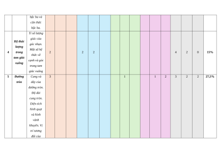 tam giác cạnh và góc vuông trong tam giác vuông 5 Đường Cung và 3 1 1 2 3 2 2 27,5% tròn dây của đường tròn. Độ dài cung tròn. Diện tích hình quạt và hình vành khuyên. Vị trí tương đối của đường thẳng và đường tròn. Vị trí tương đối của hai đường tròn. Tổng số câu 12 4 4 3 1 1 5 16 8 6 30 Tổng số điểm 3,0 2,0 2,0 3,0 4,0 3,0 3,0 10 Tỉ lệ % 30% 20% 20% 30% 40% 30% 30% 100% Lưu ý: