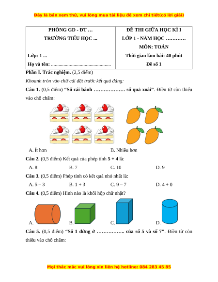 Câu 1. (0,5 điểm) “Số cái bánh ………………. số quả xoài”. Điền từ còn thiếu vào chỗ chấm: A. Ít hơn B. Nhiều hơn